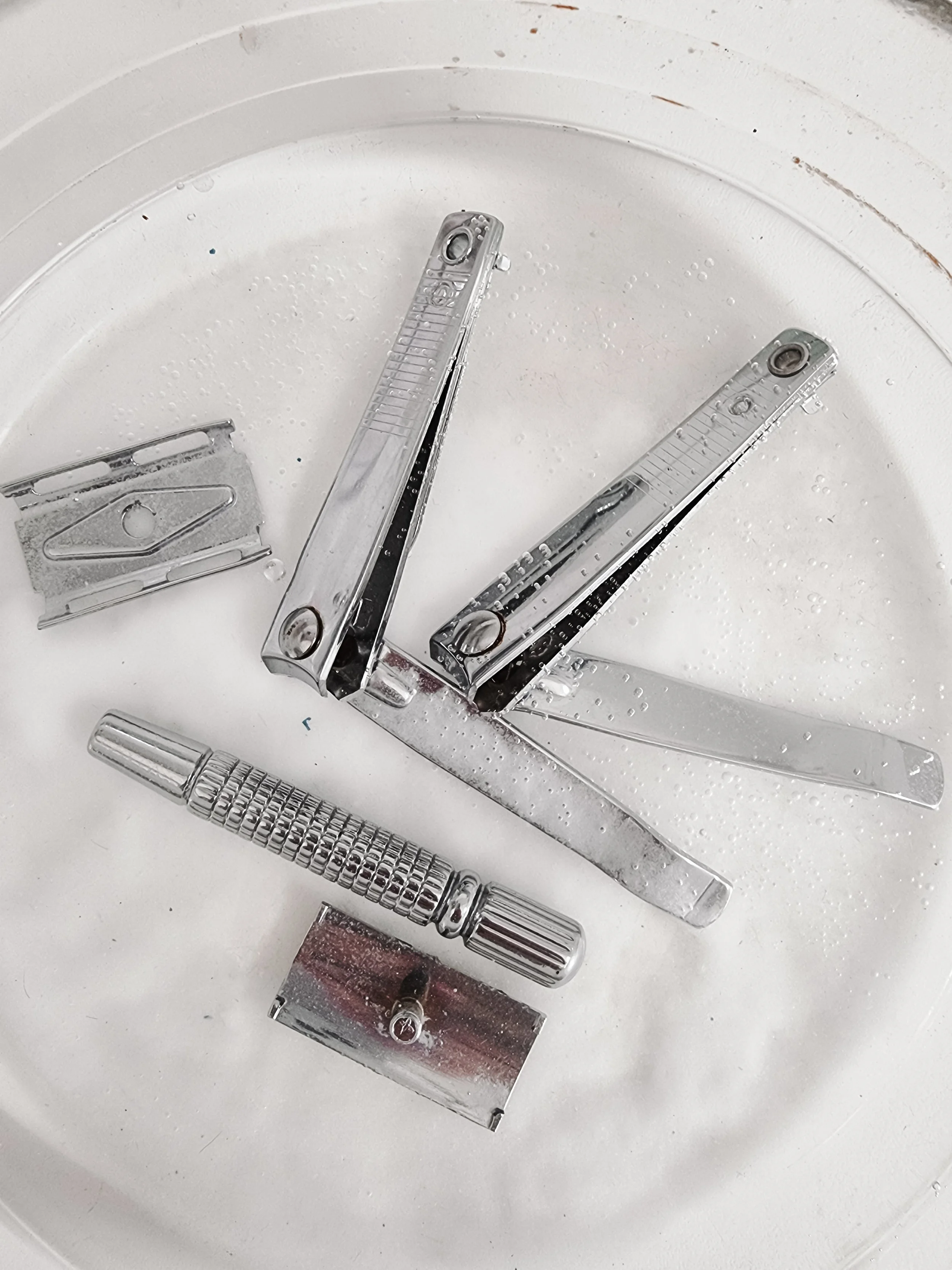 collect your rusty shaver, nail clippers, scissors or whatever else you are trying to spruce up and place them in a glass bowl