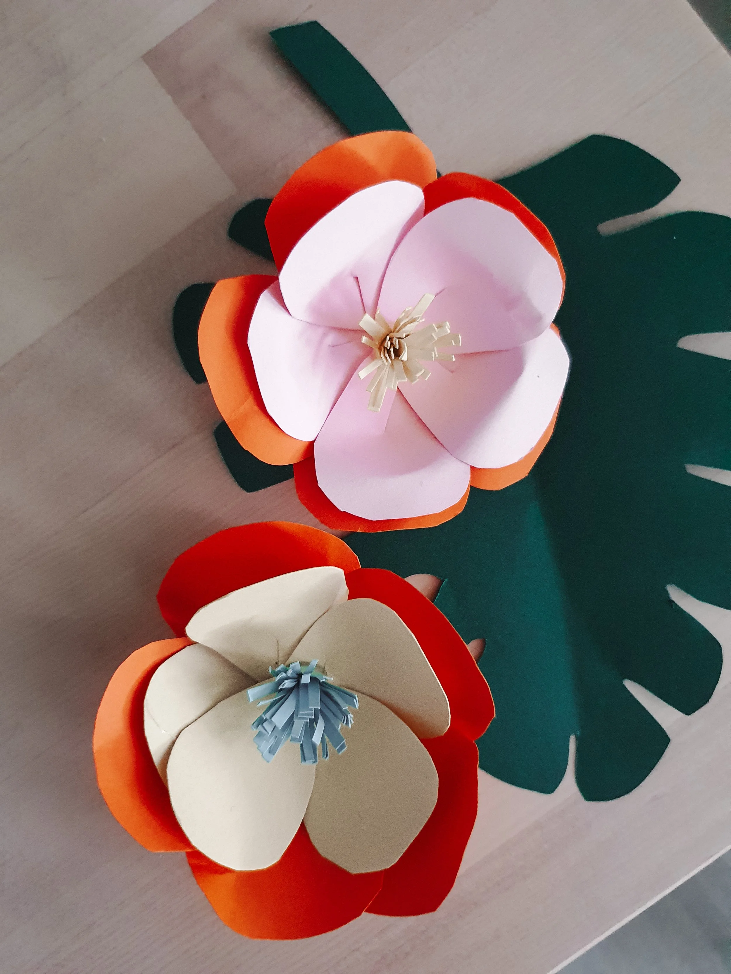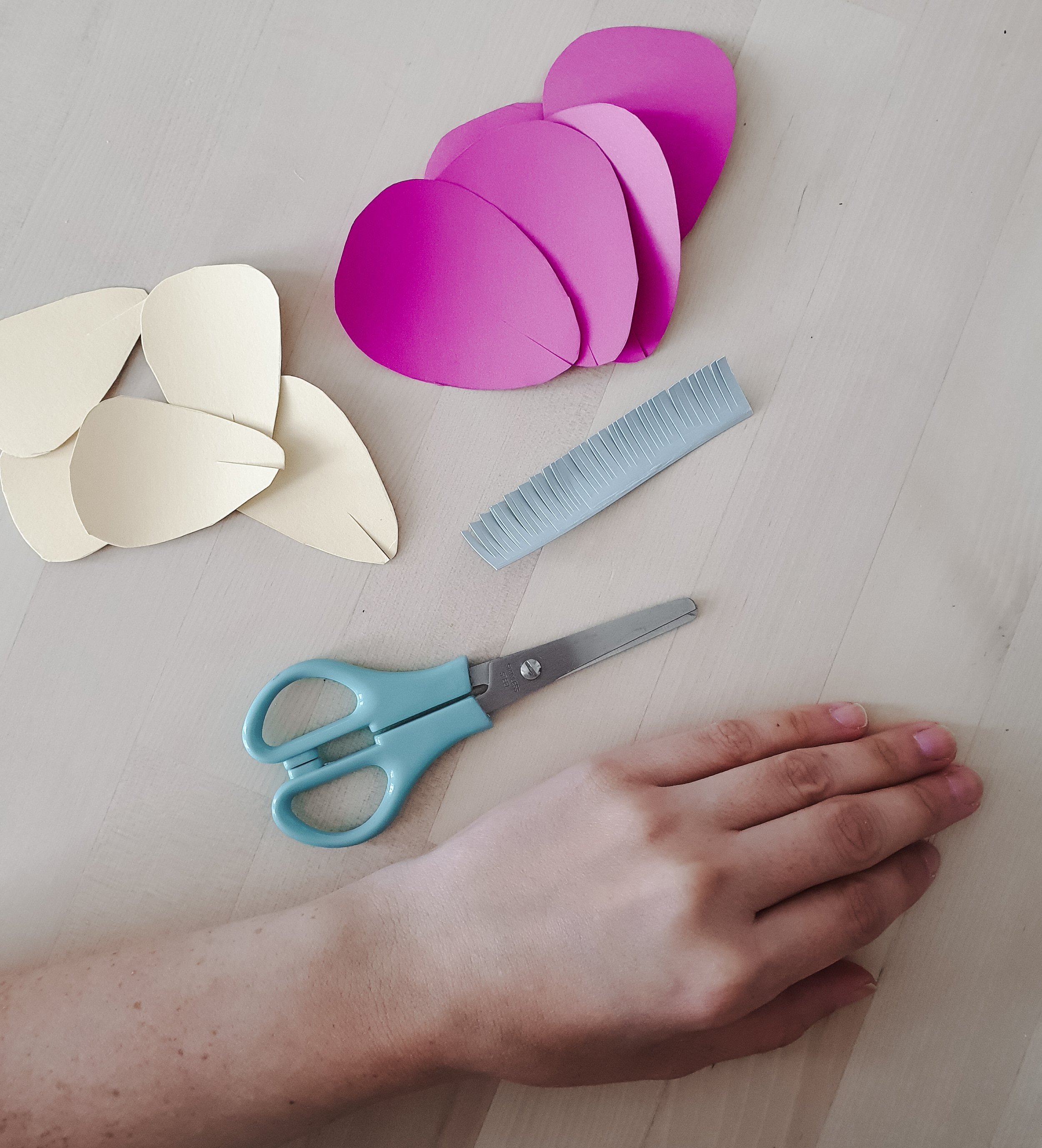 for the cardboard flowers, cut out rough petal shapes. cut a slit in each petal (around a cm in length) from the bottom upwards. each flower will need around 5 petals for the inner and outer layer, which i cut in contrasting colours.