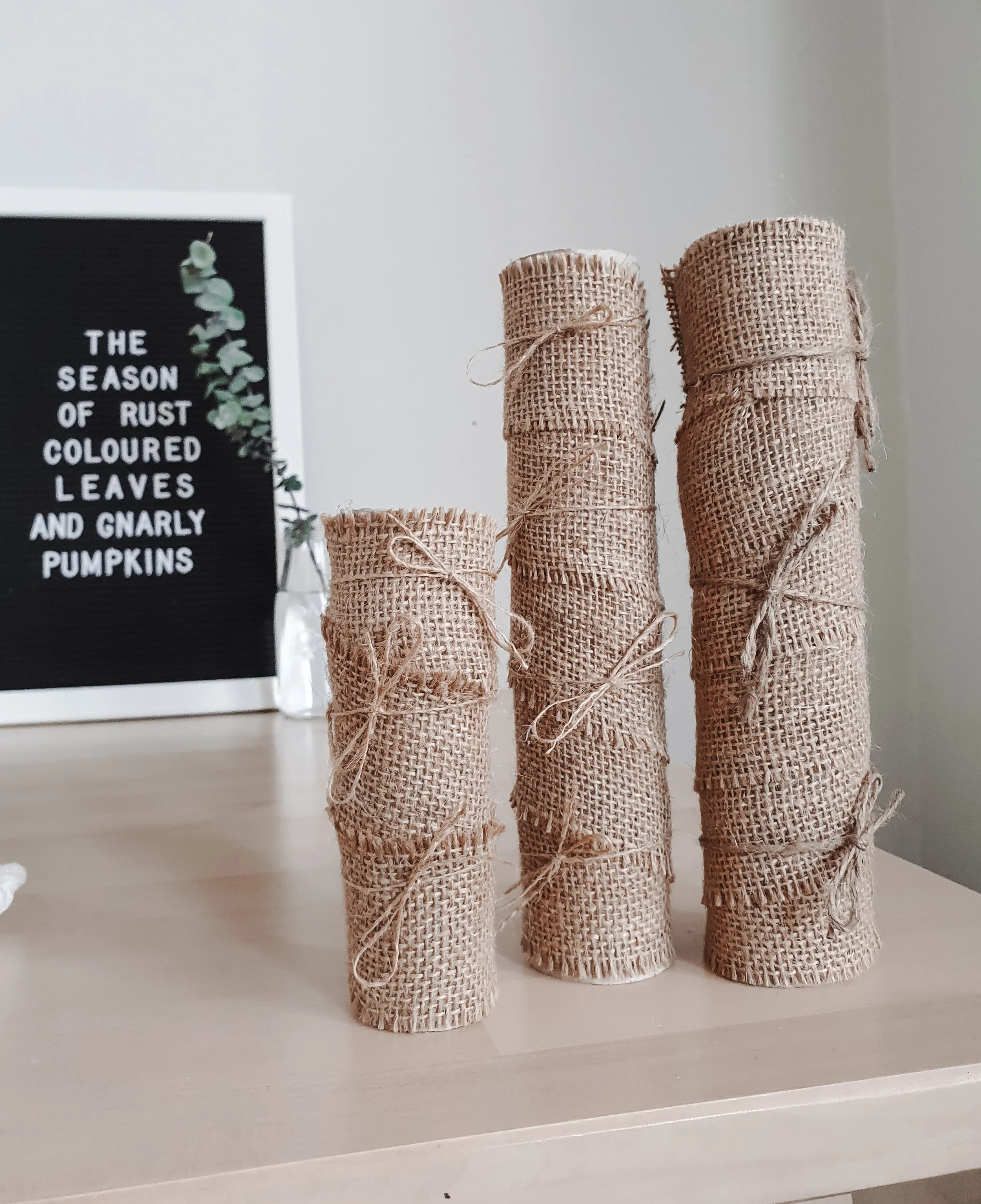 simply wrap your burlap gauze (trimmed to size) around the toilet or kitchen roll tubes and affix with hot glue or glue dots. i then secured these further by wrapping additional lengths of twine around each section of burlap gauze and knotting it with a visible bow in place.